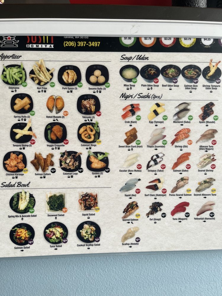 Sushi Omiya is a popular conveyor belt sushi restaurant located in Tukwila, WA. Known for its fresh and delicious sushi offerings, the menu features a variety of appetizers, salad bowls, and soup options. Customer reviews praise the generous portions of fresh fish and avocado, as well as the customizable options for sushi rolls. The restaurant also offers vegan and takeout options, making it a versatile choice for diners. With a casual atmosphere and friendly staff, Sushi Omiya provides a great dining experience for sushi lovers. If you're looking for a quick and satisfying sushi meal, Sushi Omiya is the place to go.